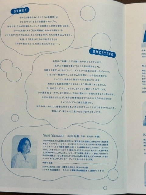 QRコードを見せて入場するという方式。これだと、絶対にチケットをなくさない。整理番号順に入場。作・演出の山田さんがロビーにいらして、まるでモデルさんのようだった。本公演を見てある「世界観」を構築することについて考えた。舞台全体がある美意識に貫かれている。舞台真ん中に大きなリビングテーブルが置かれていてペパーミントグリーンのテーブルクロスがかかっている。背景には淡いピンクのカーテンのような布に覆われ左右に木のタンスや観葉植物が置かれている。ファッションの仕事をしているのか大場みなみが一人で住む部屋。ウェス・アンダーソン映画の「グランドブタペストホテル」の色遣いにとても似ている。 そして大場さんの部屋にやってくる彼氏の山本雅幸。二人ともビルケンシュトックの定番のサンダルをルームシューズとして履いている。山本さんの赤いセーターと同系色のソックス。大場さんはアースカラーのワンピースにモスグリーンのざっくりしたカーディガンを着ている。大道具、小道具、衣装、そして部屋にかけられている絵画なども含めて、ものすごく可愛くしゃれた世界観がそこにある。そして、この舞台には特徴的な二人のメイドが登場する。劇の開始前から劇場内を歩き回る二人のメイド、シュッとした立ち姿がまるで雑誌の流行通信(https://www.instagram.com/ryukotsushin/?hl=j)や装苑(https://soen.tokyo/) のファッションフォトのような様子。青みが買ったグレイの長いワンピースに黒いソックス、ブルーグレイのペタンコ靴、白いシャツの襟がワンピースから出ていてアクセントになっている。などなどと詳細に書き起こしているが一見すれば瞬間に理解できること。それこそが世界観の構築なのだろう!劇団のHPのパリ公演時の写真は以下、https://zeitakubinbou.com/archives/works/wakaomoparis まさにこのページの写真の世界。男女の役割とは?が劇中で問われてくる。大場の友人の佐久間麻由が部屋にやってくる。彼女の元カレがDV(ドメスティックバイオレンス)をふるう男だったらしく、彼女は元カレと別れたのだが、その時の経験がトラウマになっていて男という存在自体を憎んでいる。実は、劇中で大場が妊娠したことを山本に告げるシーンがあるのだが、男女の役割とは何か?子どもを身ごもり産むということはどういうことなのか?そして、親になる男女の関係とはどういうおとなのか?がある種、独特な語り口で発声される。特に大場さんの発声が明瞭で大きな声で発するのは、どういうことなのか?と考えた。ある種の緊張関係から来るものなのか?一方、山本は普通の発話であり、その発声の違いからも男女関係の妊娠という事実に対しての認識の違いをあぶりだそうとしているのだろうか? ![]() 本作の後半はまさにこの言葉に代表されるような転換が行われる。それを観客は想像し、岡田さんの言葉のようなことを想うのではないか?そこの衝撃がとても面白く、過去のパリ公演などで外国の観客の反応はどうだったのかがとても知りたくなった。本公演では全編「英語字幕」が投影されているので、この公演を見に来た外国人の感想も聞いてみたい。いろんな人がいろんな想像をもって対話するようなきっかけを与えてくれる作品。